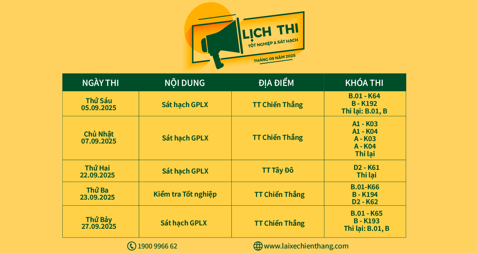 Trung tâm GDNN Đào tạo và Sát hạch lái xe Chiến Thắng xin thông báo lịch thi tốt nghiệp và sát hạch lái xe tháng 09/2025...